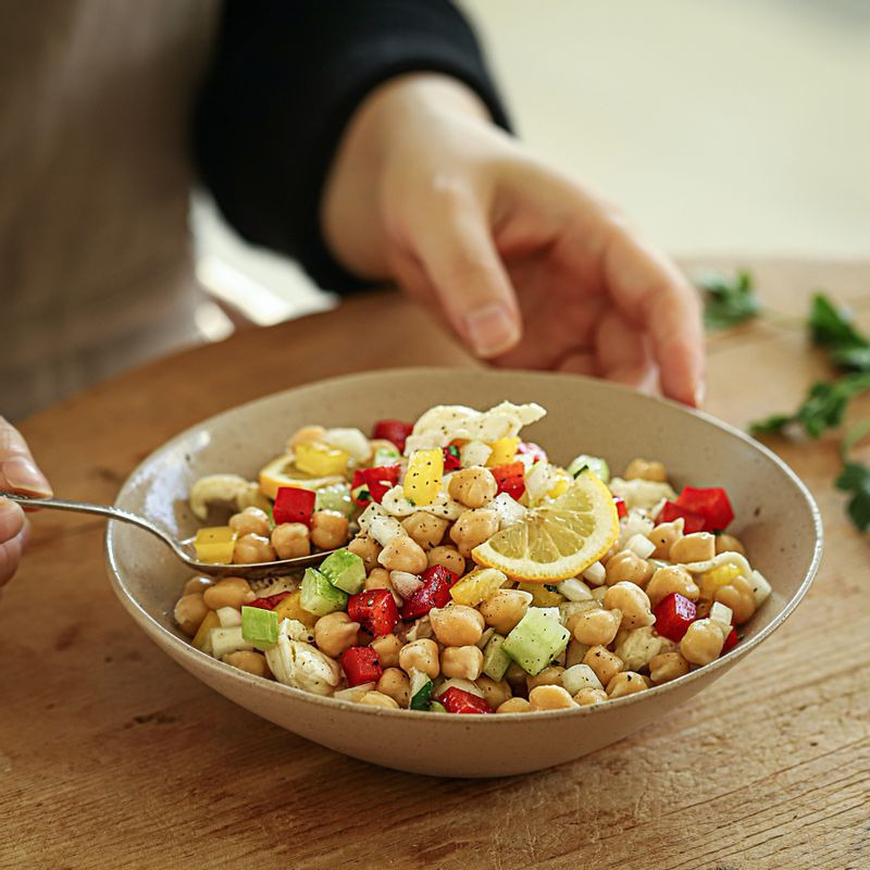 - 재료: 병아리콩 1컵, 토마토 1개, 오이 1개, 올리브 오일 1큰술, 발사믹 식초 1작은술.